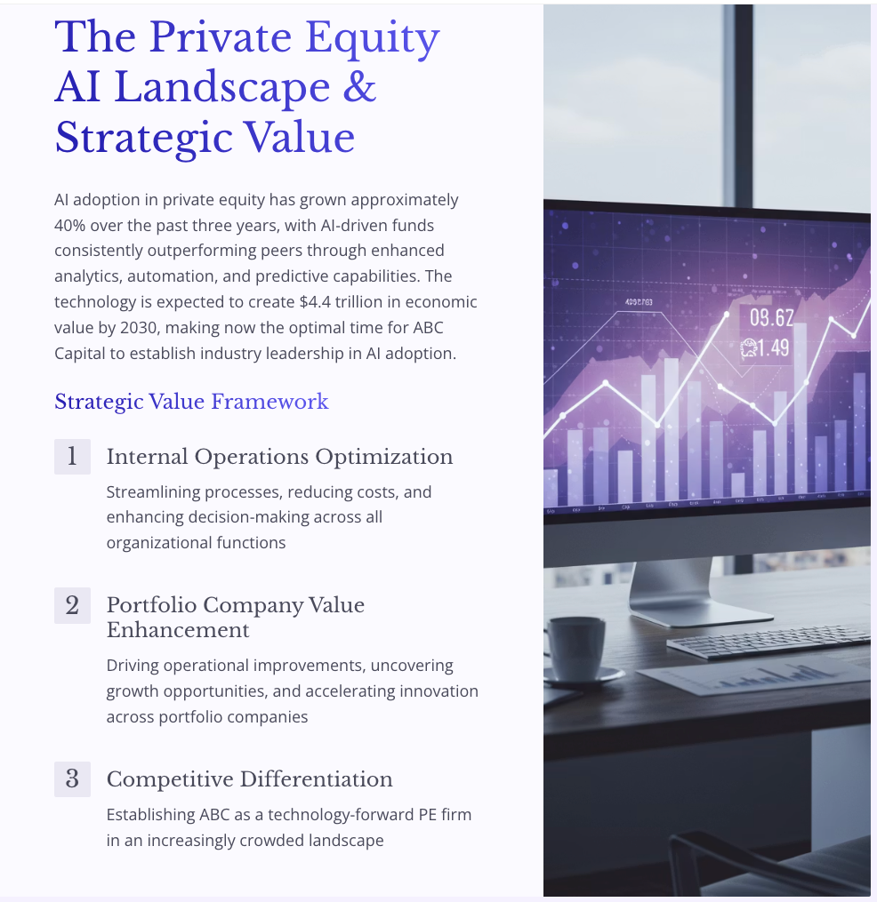 AI Strategy Categories: Select a Category AI Strategy AI Strategy Strategic Implementation of AI in Private Equity: A Comprehensive Guide for ABC Capital Sale Price: $9.99 Original Price: $19.99 Sale Add to Cart Added!